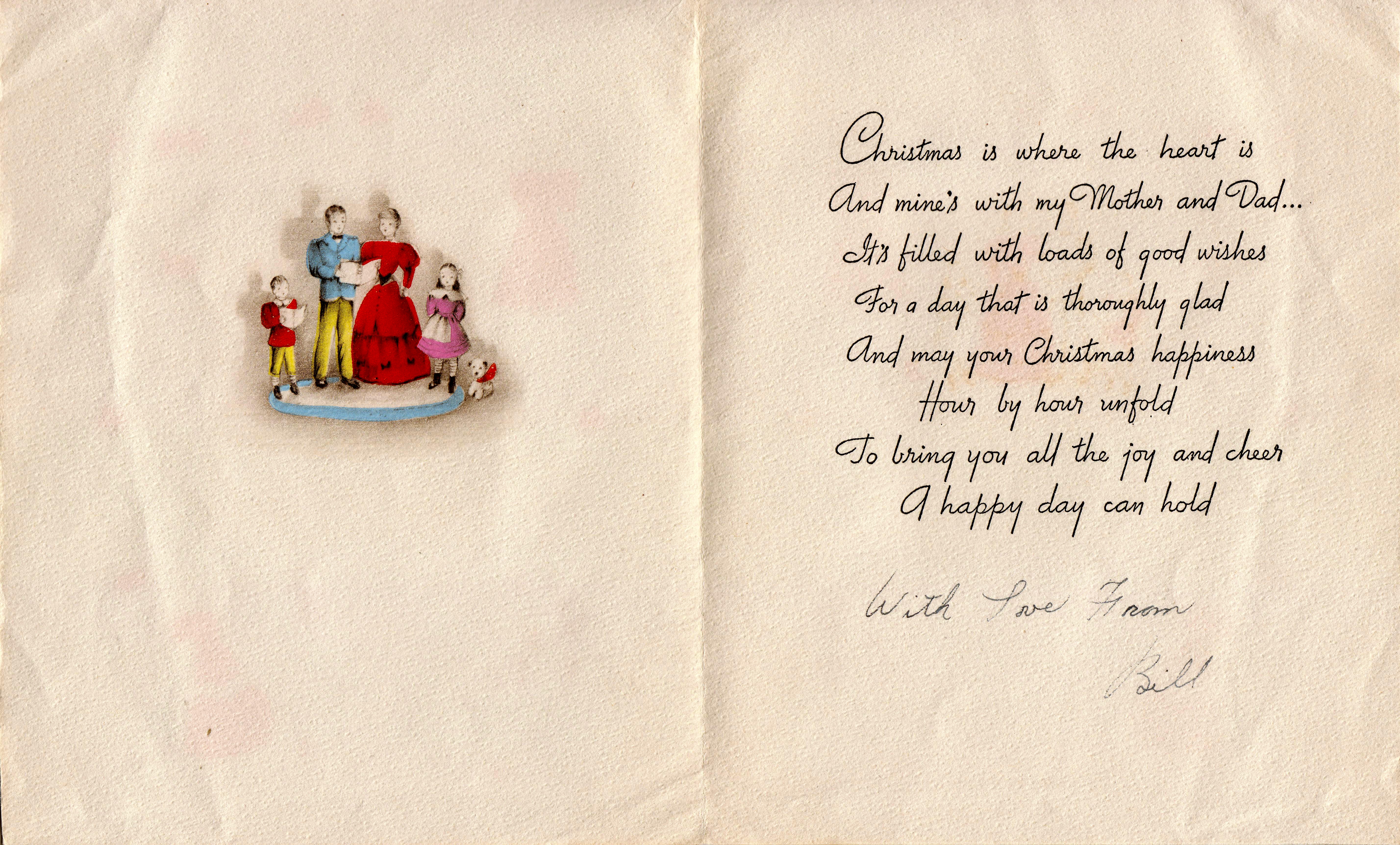 Bill spends Christmas in Mississippi. Cards are exchanged with the family. His younger brother Abe enlisted in October of 1940 and is in training in the US. The Girls (Eva, May and Ruth) are living together at a boarding house in Dayton, OH; Eva and May have jobs, while Ruth works and attends high school. Anna, William and the Kids (Dick, Fanny, Sam, Annie, Victor and Pat) are living on Decatur Street in Eaton, OH.