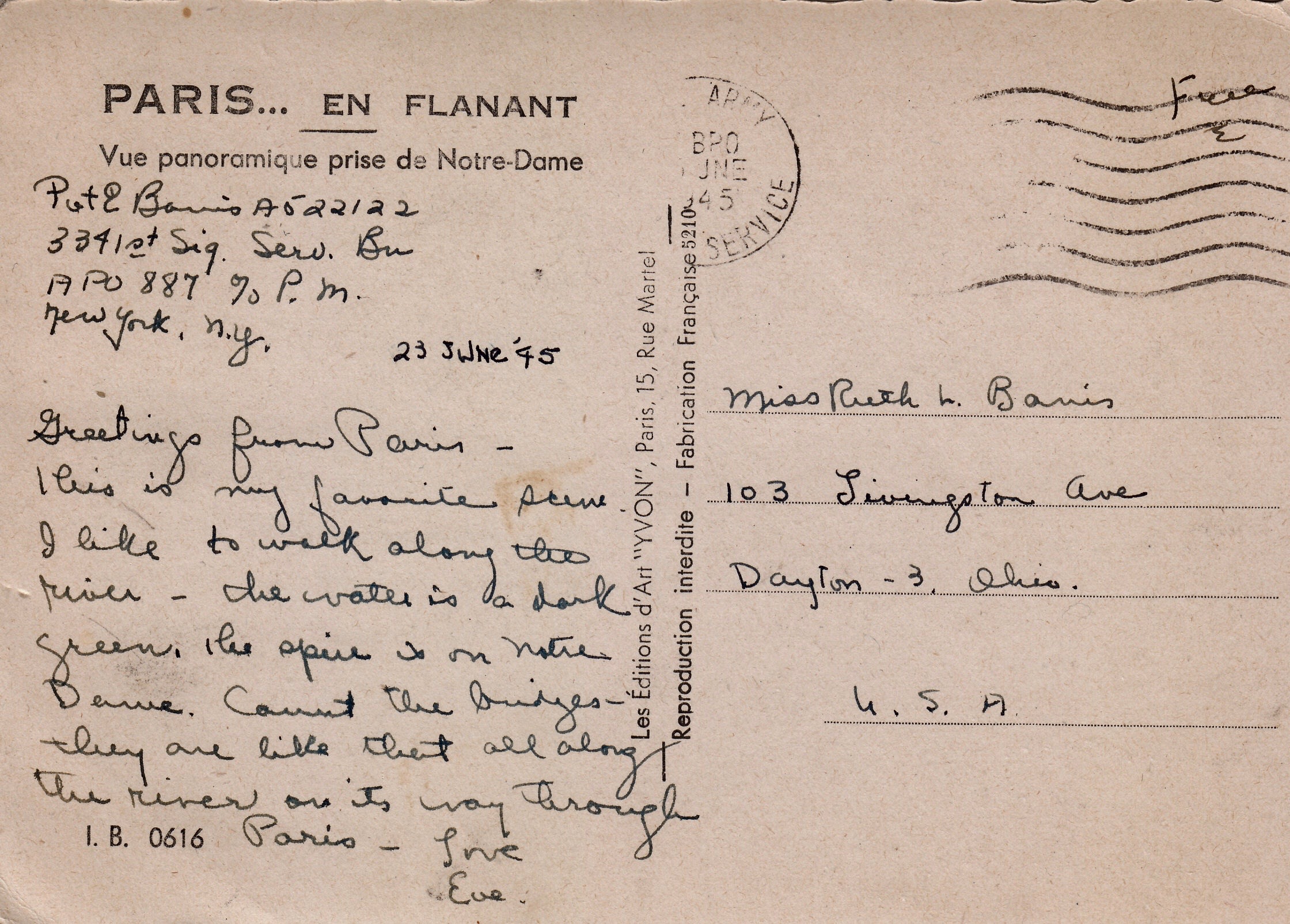 postcard to ruth from eva in paris