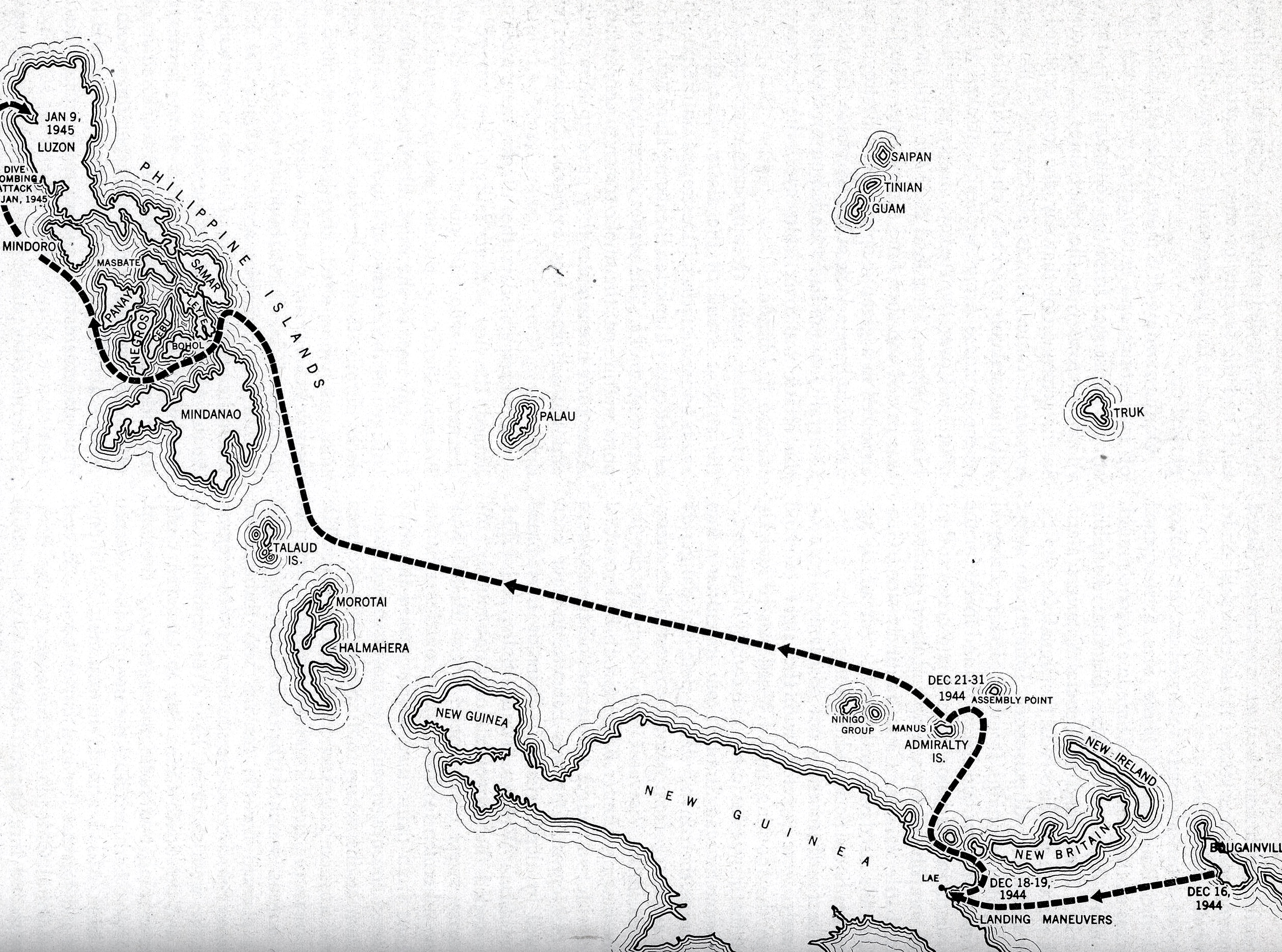 On the morning of December 18th the convoy reached the allied base in Huon Gulf, New Guinea.  There the 37th joined other troops and joined in a full-dress rehearsal for the landing in Luzon.  The convoy left and moved to the huge naval base on Manus Island.  There the troops on deck could see Navy cruisers, aircraft carriers and battleships.