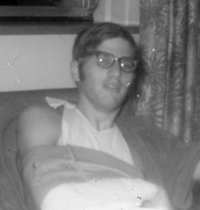 “Turn the bus around… We gotta go back,” someone yelled. I glanced at the driver and saw his shoulders slump. A few miles later, the bus exited the highway, crossed over, turned onto a ramp and we were heading south on I- 75. In a few minutes the bus exited again, passing near the service station we had recently visited. Many of the patrons were now standing, some swaying, as they stared out of the bus windows. There was an air of competitiveness, each hoping to be the first to spot the castaways. We had driven a few miles north on I-75, when one of the lookouts shouted, “I see ’em!” I abandoned my detached air, stood up and worked my way forward until I could see out of the front bus window. I saw two men on the shoulder of the highway. One was a young man wearing a bright red plastic batting helmet. He held out an arm as if reaching for the highway. His hand was clinched in a fist and his thumb was pointing up in the classic hitchhiker pose. But the effort seemed to have strained his sense of balance; his one leg was buckled, and he leaned heavily on the other man for support. On closer inspection, they both appeared to be leaning on each other. The other man was, of course, my dad. The bus pulled past the glassy-eyed and grinning men. For a moment they looked startled, thinking (a challenging exercise in their condition) that the bus driver was only going to slow down and pass them by. But, alas, the driver wasn’t a prankster. I expect he was trying very hard to end this trip and divorce himself from this group.