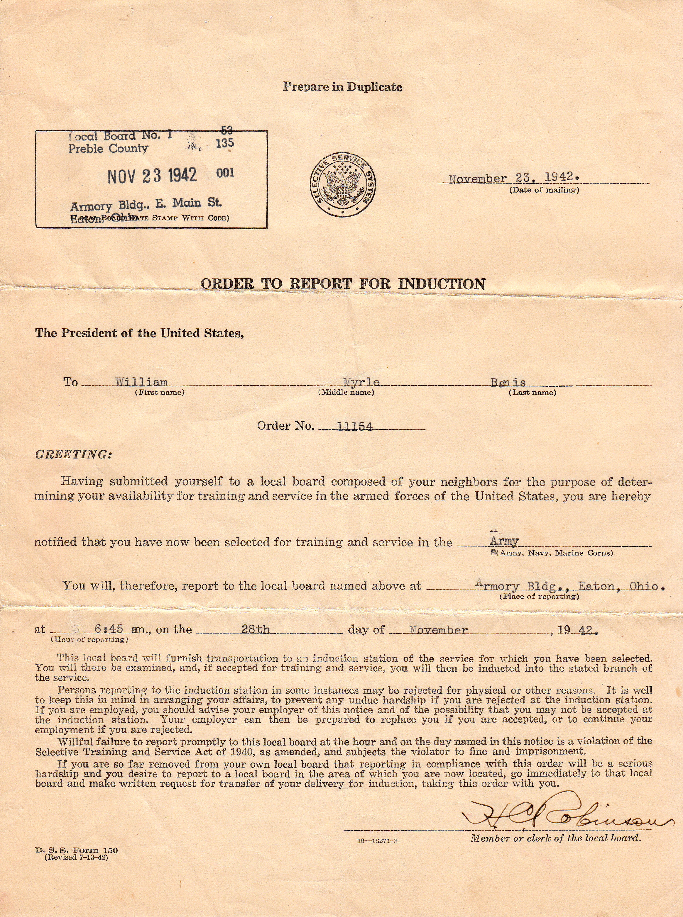 Bill dropped out of school and at the age of 17, joined the Civil Conservation Corps (CCC) and left for Nevada in early 1939. Within the next few years, May dropped out of school but found a job and joined Eva in Dayton. In October 1940, Abe, also a high school dropout enlisted in the Army at the age of 18 and was stationed in Fort Thomas, Kentucky. In 1941, Ruth left home and moved to Dayton where she lived with her sisters, May and Eva. The three “girls” lived in a boarding house on West Third Street in Dayton. In the fall Ruth entered Roosevelt high school as a junior. Pat was born in September, 1942, and the family now numbered 13. It was a difficult and nearly fatal labor for the 42- year-old Anna. Bill returned home from the CCC and other adventures “out west” later that fall. Bill was inducted into the US Army in November and departed for basic training in early December.